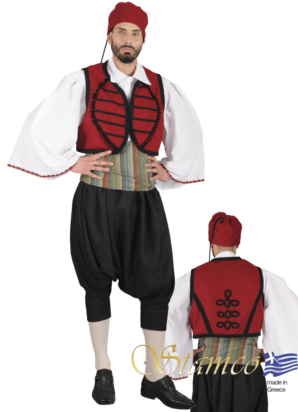 The Traditional Maniatis Costume consists of: waistcoat, shirt, trousers, hat, sash