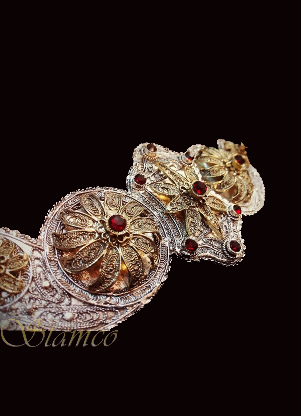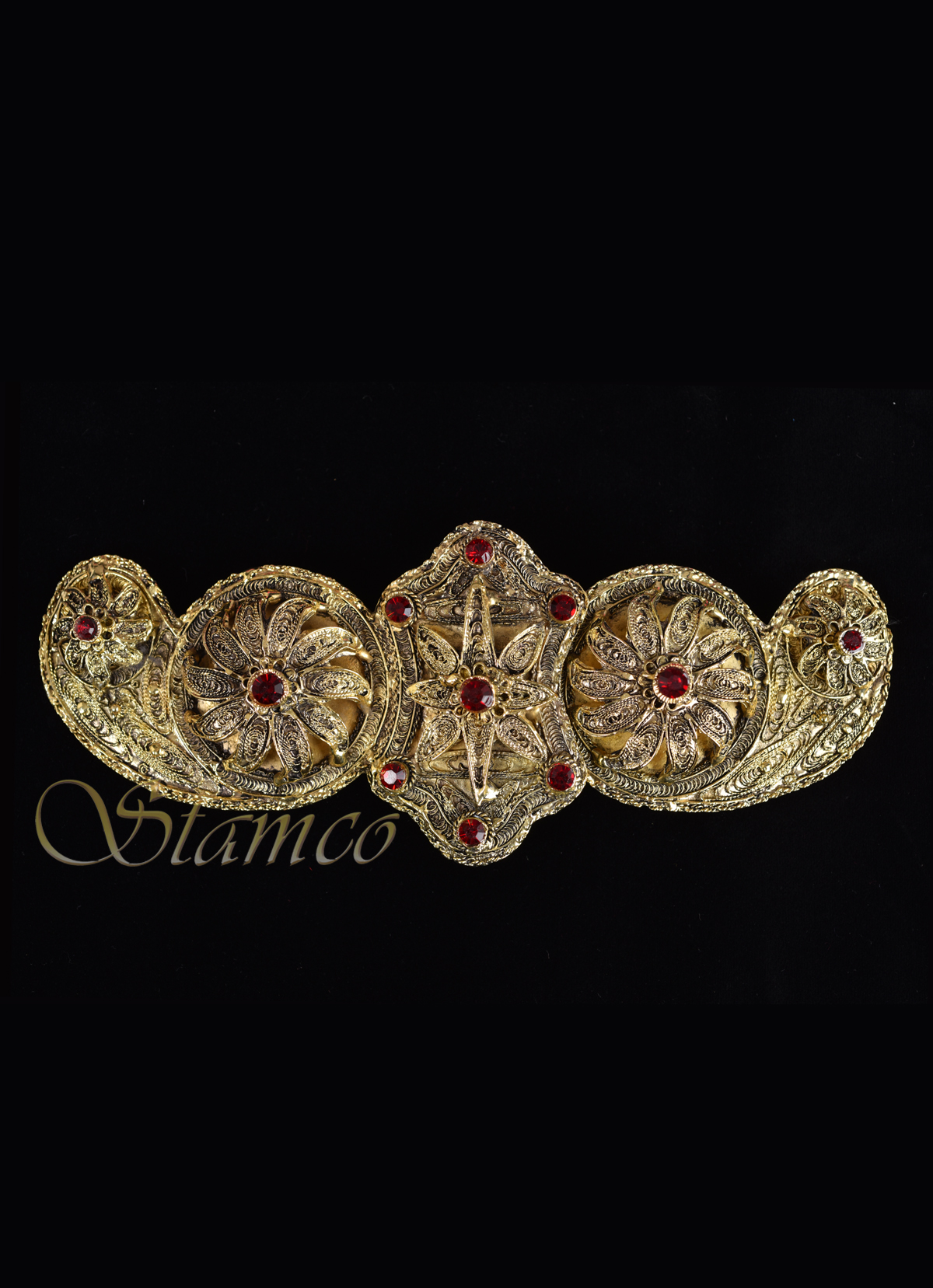 Waist jewelry that is decorated with red stones while it is made with the technique of filigree.