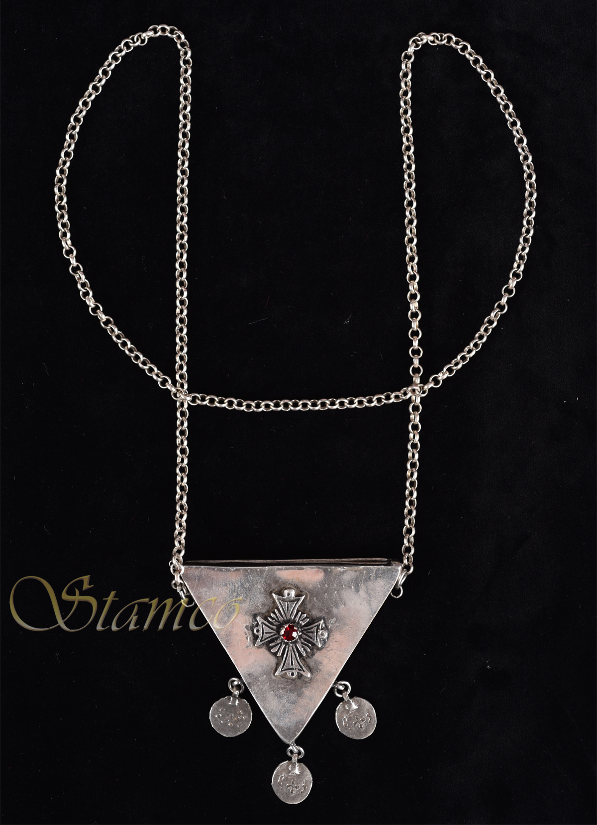 A very beautiful silver piece of jewellery in a triangular shape. On the face, it has the Cross with a red stone while it is completed by a long chain and 3 silver coins
