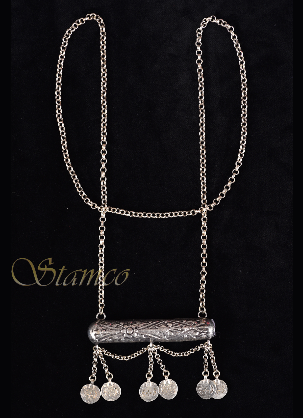 A very beautiful silver jewelry in a rectangular shape. It has carved designs with flowers, a long chain and at the end of it, 6 silver coins caught in pairs.