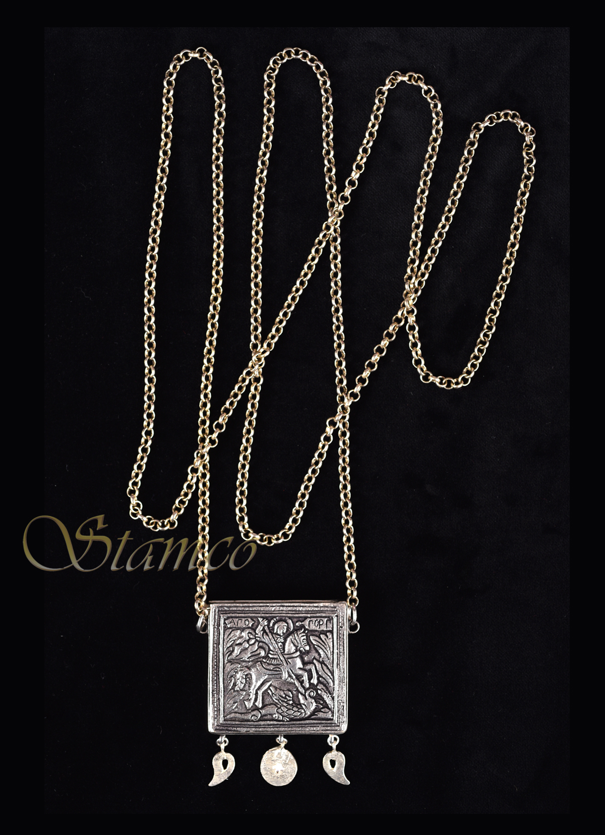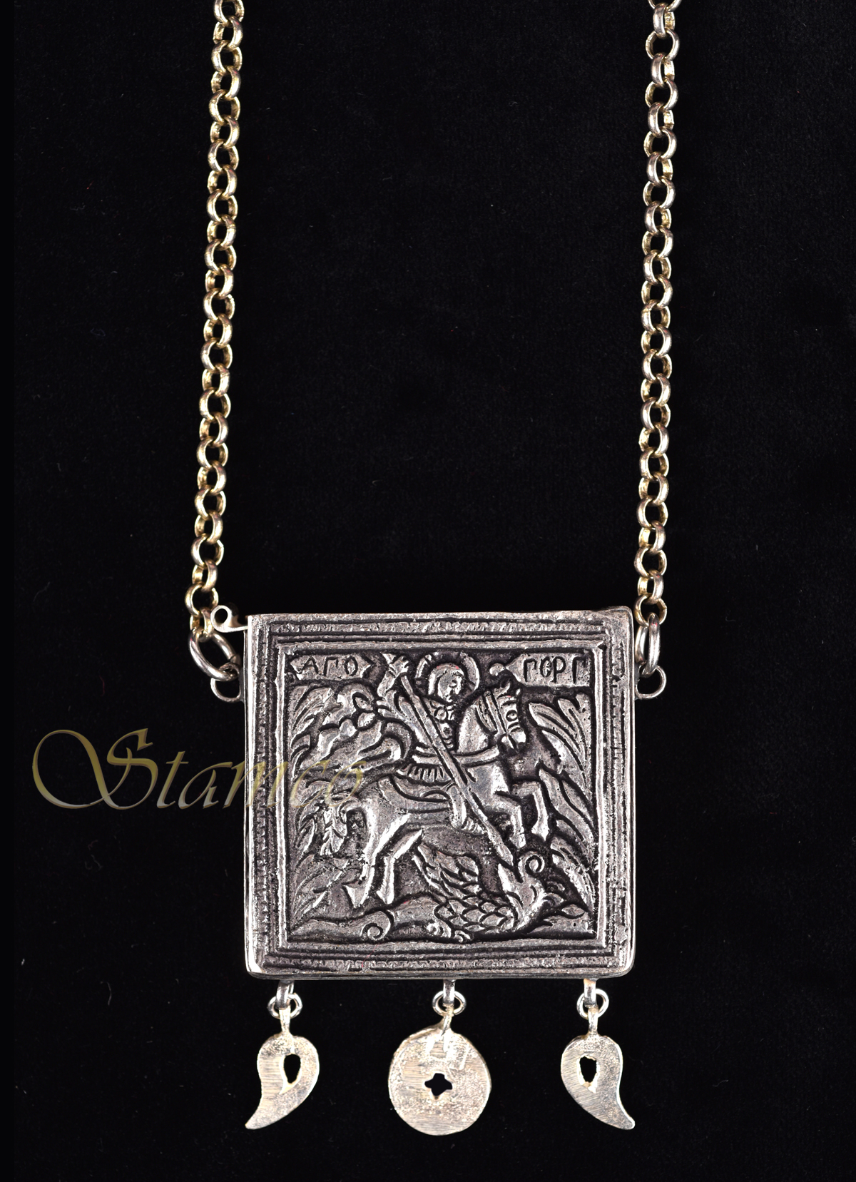 A very beautiful silver jewel in a square shape that has engraved Saint George. It has a long chain and at the end 3 silver pendant designs.
