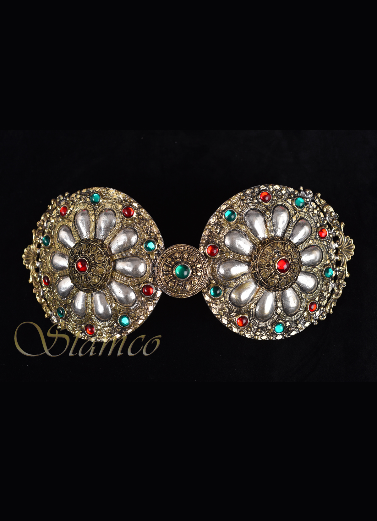 Traditional buckle of Asia Minor that is decorated with red and green stones and has a rich floral decoration. It is a wonderful and extremely interesting waist jewelry as it combines many construction and decoration techniques.