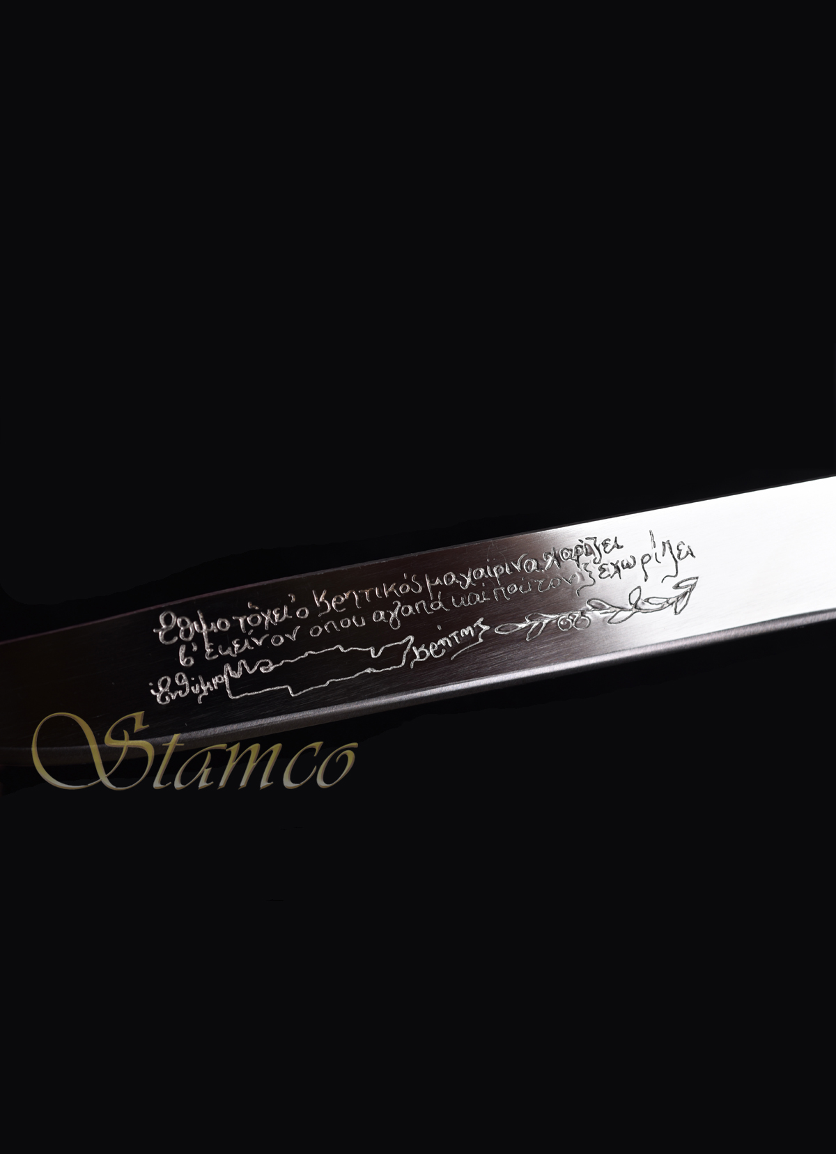 From the base of the case hang 3 chains with coins of the Cretan state while the knife is carved with Cretan mantinada.