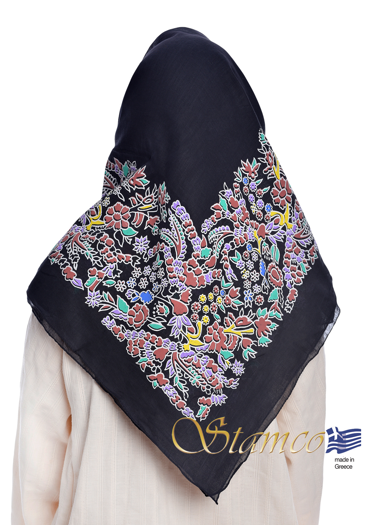 Greek Traditional Cotton black scarf with printed colourful flowers.